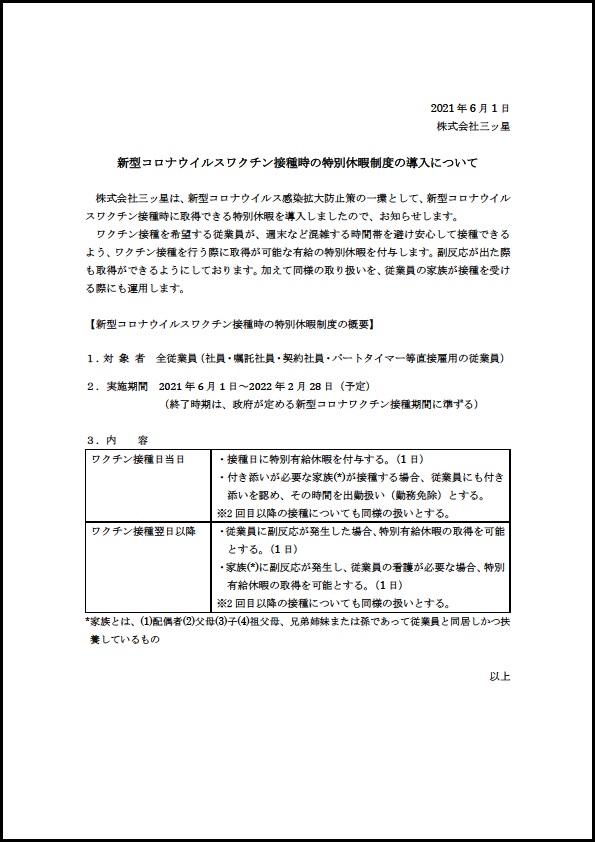 新型コロナウイルスワクチン接種時の特別休暇制度の導入について